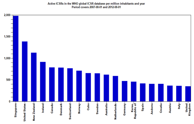 Slika 2. Broj prijava nuspojava na milijun stanovnika u bazi Svjetske zdravstvene organizacije (Uppsala Monitoring Centre - VigiBase), kolovoz 2007. - kolovoz 2012. godine