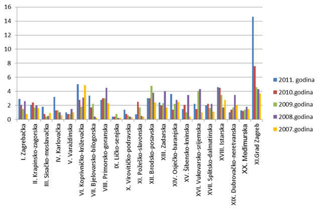 Broj prijava iz svake od ovih skupina prikazan je u Tablici 1, a njihov udio na Slici 1.